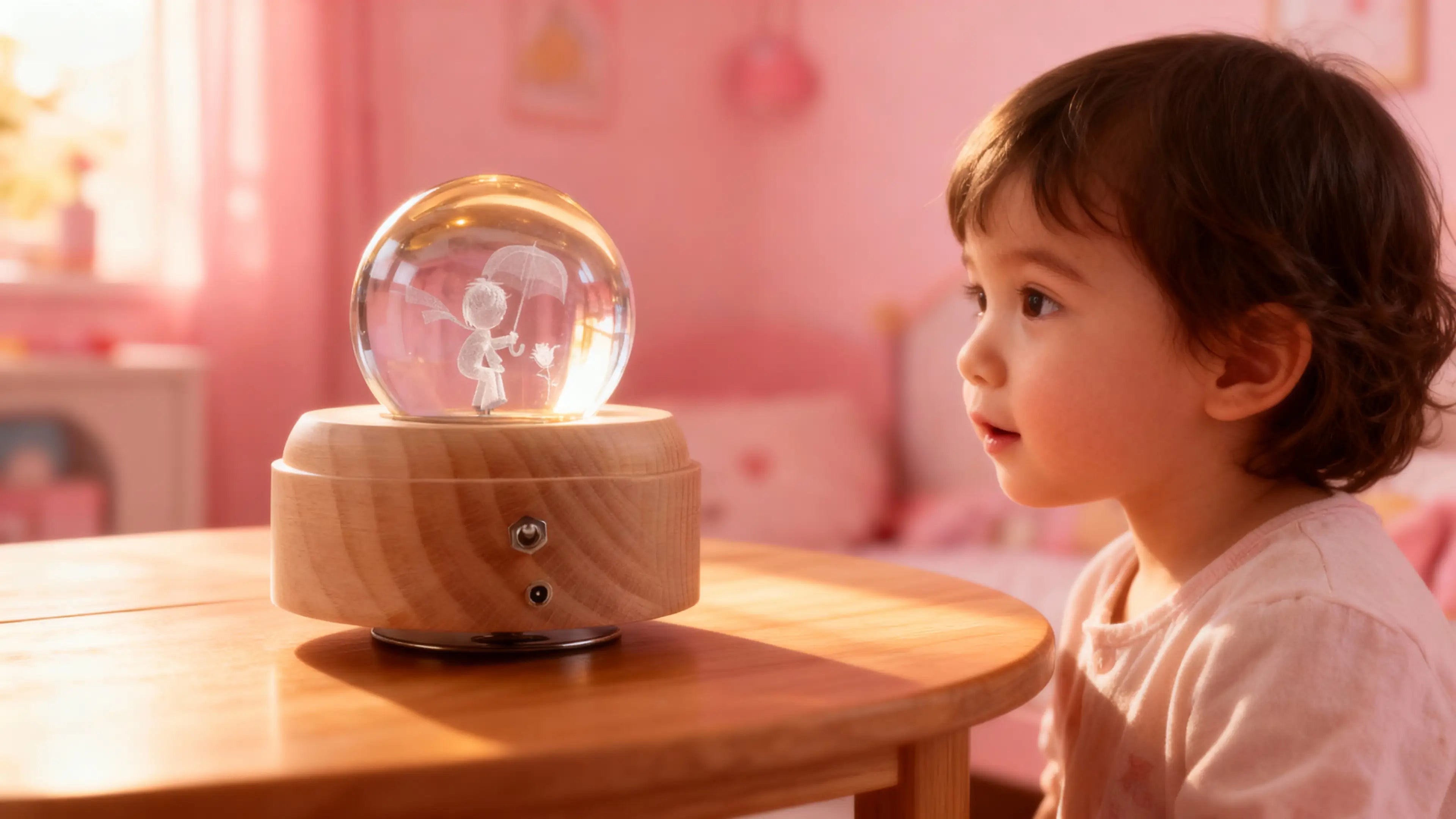 Ma Boîte Enchantée – Boîte à musique petit garçon en cristal et bois de hêtre